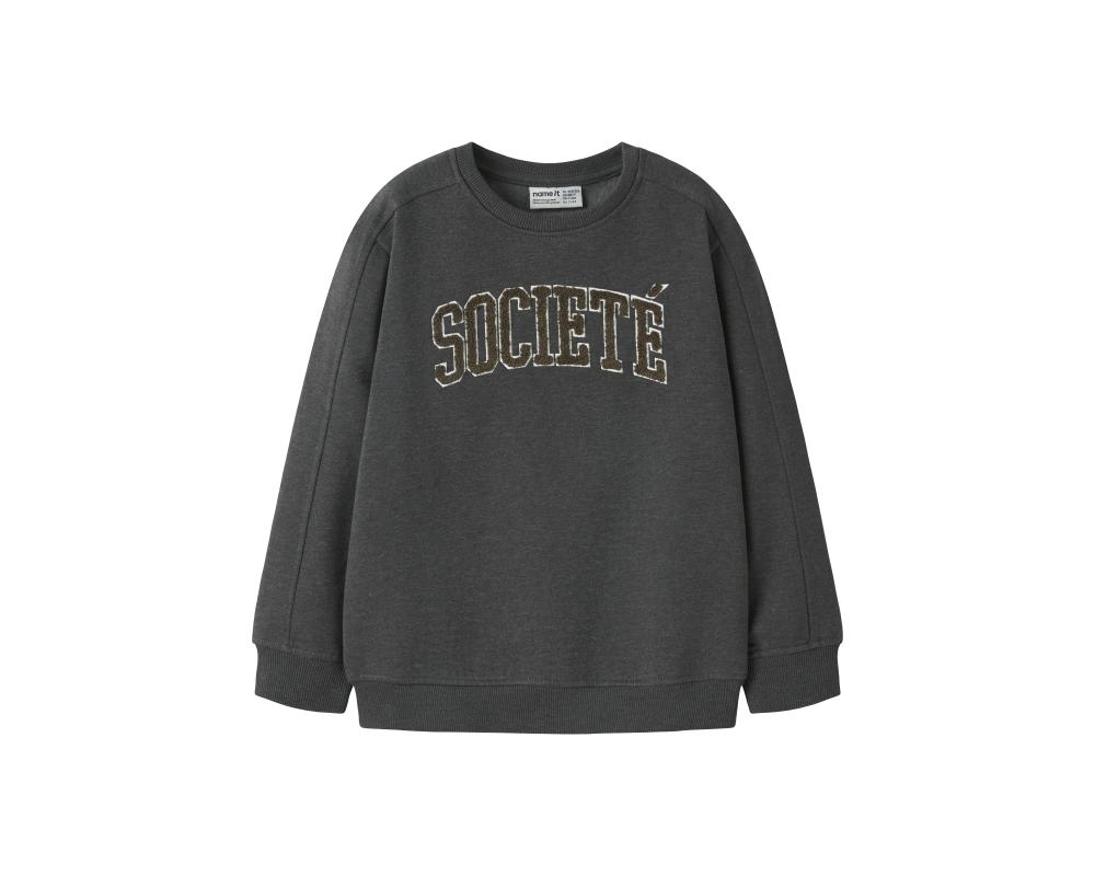 Dieses lässige Jungen-Sweatshirt von Name it ist der perfekte Begleiter für aktive Kinder. Das dunkelgraue Oberteil besticht durch seine hochwertige Verarbeitung und den angenehmen Tragekomfort. Der besondere Blickfang ist die aufwendige SOCIÉTÉ-Stickerei auf der Vorderseite, die dem Sweatshirt einen sportlich-modernen Look verleiht. Die Stickerei in Braun- und Weißtönen hebt sich kontrastreich vom grauen Untergrund ab und sorgt für einen coolen Vintage-Effekt. Mit seinem klassischen Rundhalsausschnitt und den gerippten Bündchen an Ärmeln und Saum bietet das Sweatshirt eine bequeme Passform. Die langen Ärmel machen es ideal für kühlere Tage und Übergangszeiten. Das weiche Material garantiert höchsten Tragekomfort beim Spielen, in der Schule oder in der Freizeit. Dieses vielseitige Sweatshirt lässt sich mühelos mit Jeans, Jogginghosen oder Shorts kombinieren und ist somit ein echtes Must-have für die Kindergarderobe.Langärmeliges Sweatshirt